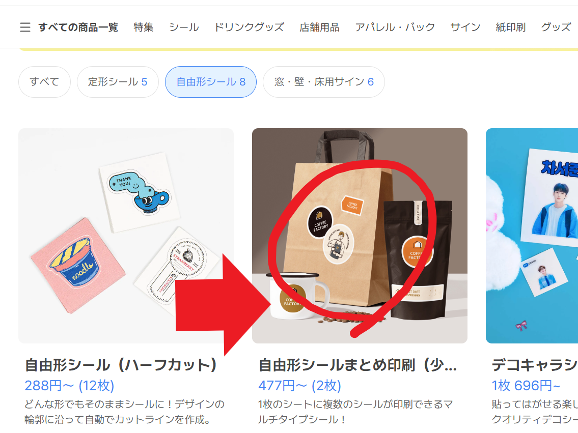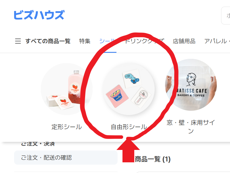 ビズハウズのホームページ画面の商品一覧→シール→自由形シールを選びます。