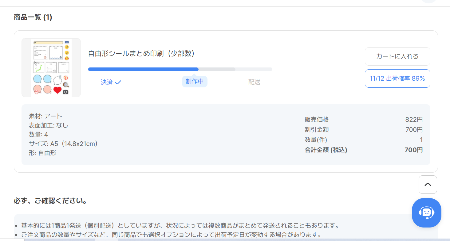 前回注文した定形シールは送料無料だったのですが、今回の自由形シールまとめ印刷(少部数)は送料がかかる商品だったようです。(枚数が4枚と少量だったからかな?)