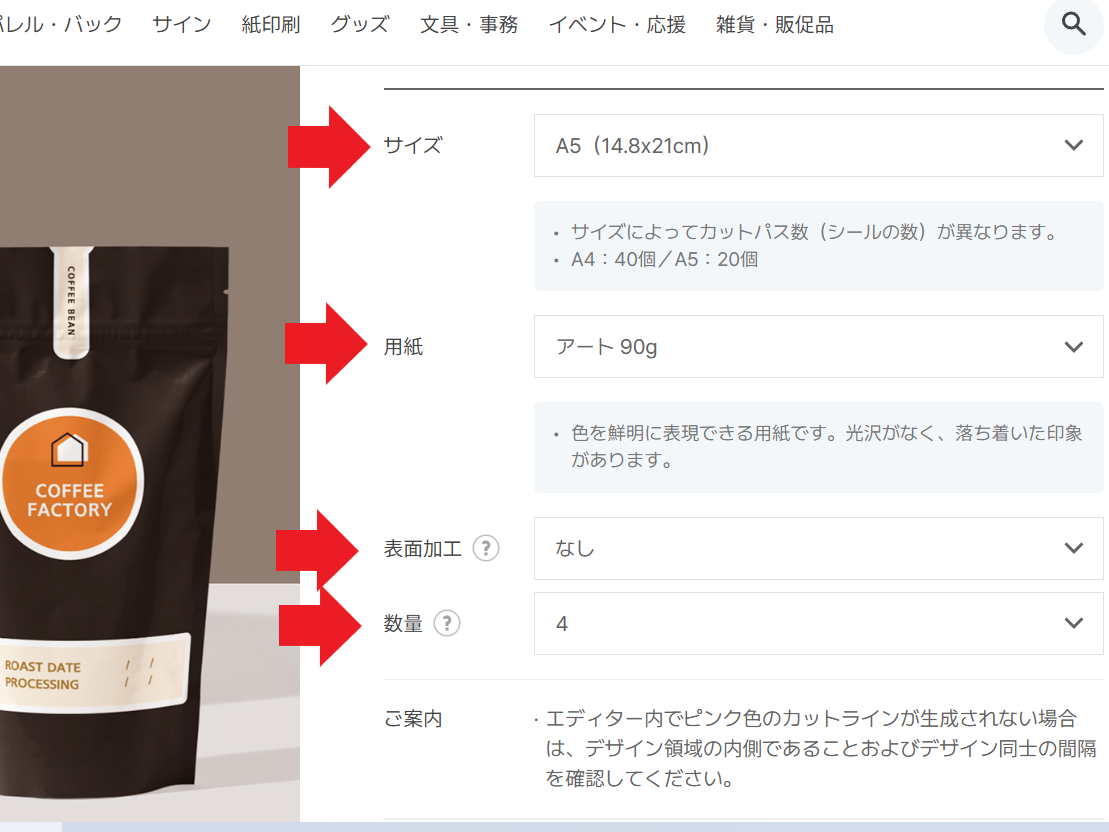 シールのサイズ、用紙の種類、表面加工の有無、数量を選びます。