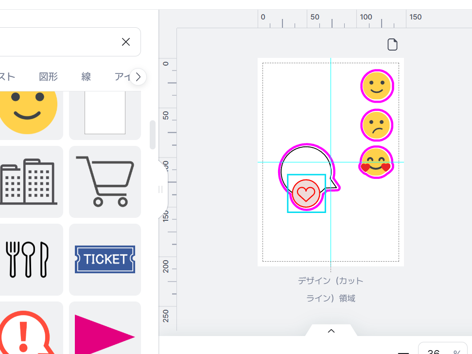 吹き出し素材の上にハート素材を重ねると、合わせて1つのカットラインが生成されました。